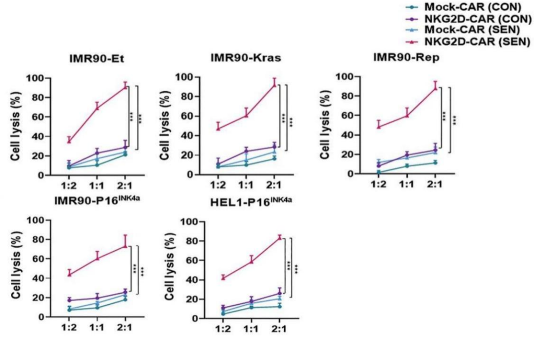 The researchers treated IMR90 cells with etoposide (50 μM) to construct the IMR90-et cell line, overexpressed the oncogene Kras (IMR90-Kras), replication failure (IMR90-Rep), and overexpressed P16 INK4a to construct in vitro cell senescence, and Induces the expression of its ligands (NKG2DL) including MICA, MICB, ULBP1-6, etc. After these constructed cell models were co-incubated with NKG2D-CAR T for 8 hours, the NKG2D-CAR T cells showed obvious killing effects at the effect-to-target ratios of 1:2, 1:1 and 2:1.