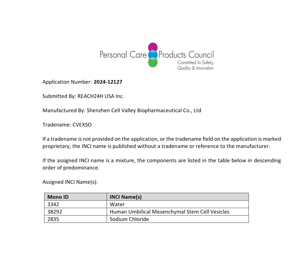 The INCI name serves as the unique identifier for cosmetic ingredients in global R&D, production, and trade. Shenzhen Cell Valley completed the technical validation and application process over two years, and the successful certification of CVEXSOTM signifies: