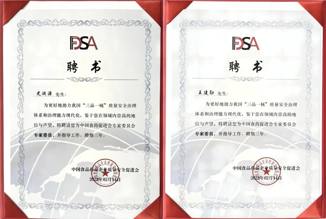 董事长史渊源、首席科学家王建勋入选中国食品药品企业质量安全促进会专家委员
