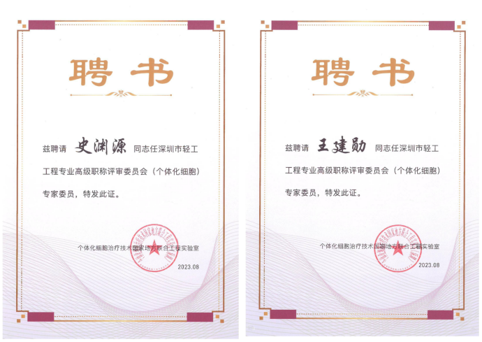 董事长史渊源、首席科学家王建勋入选深圳市轻工工程专业高级职称评审委员会(个体化细胞)专家委员