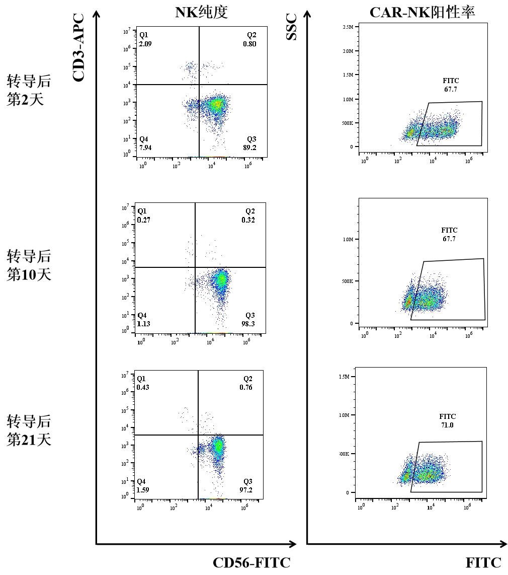 运用深圳凯发天生赢家一触即发首页独有的PackRV-SS系统生产的逆转录病毒载体转导NK细胞技术,其转导效率稳定在60%以上,且阳性率不断保持稳定;而且CAR-NK细胞在转导后培养的30天内增殖可达10000倍。